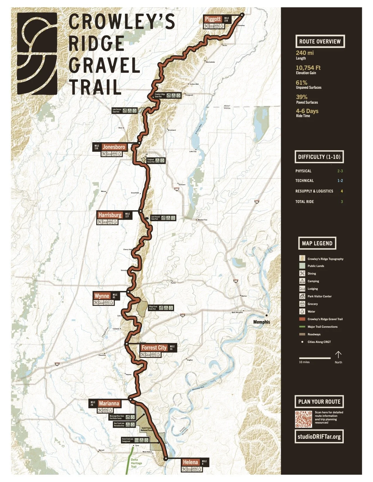 The Crowley’s Ridge Gravel Trail links 250 miles of rural roads across 8 counties and 18 historic farming communities.